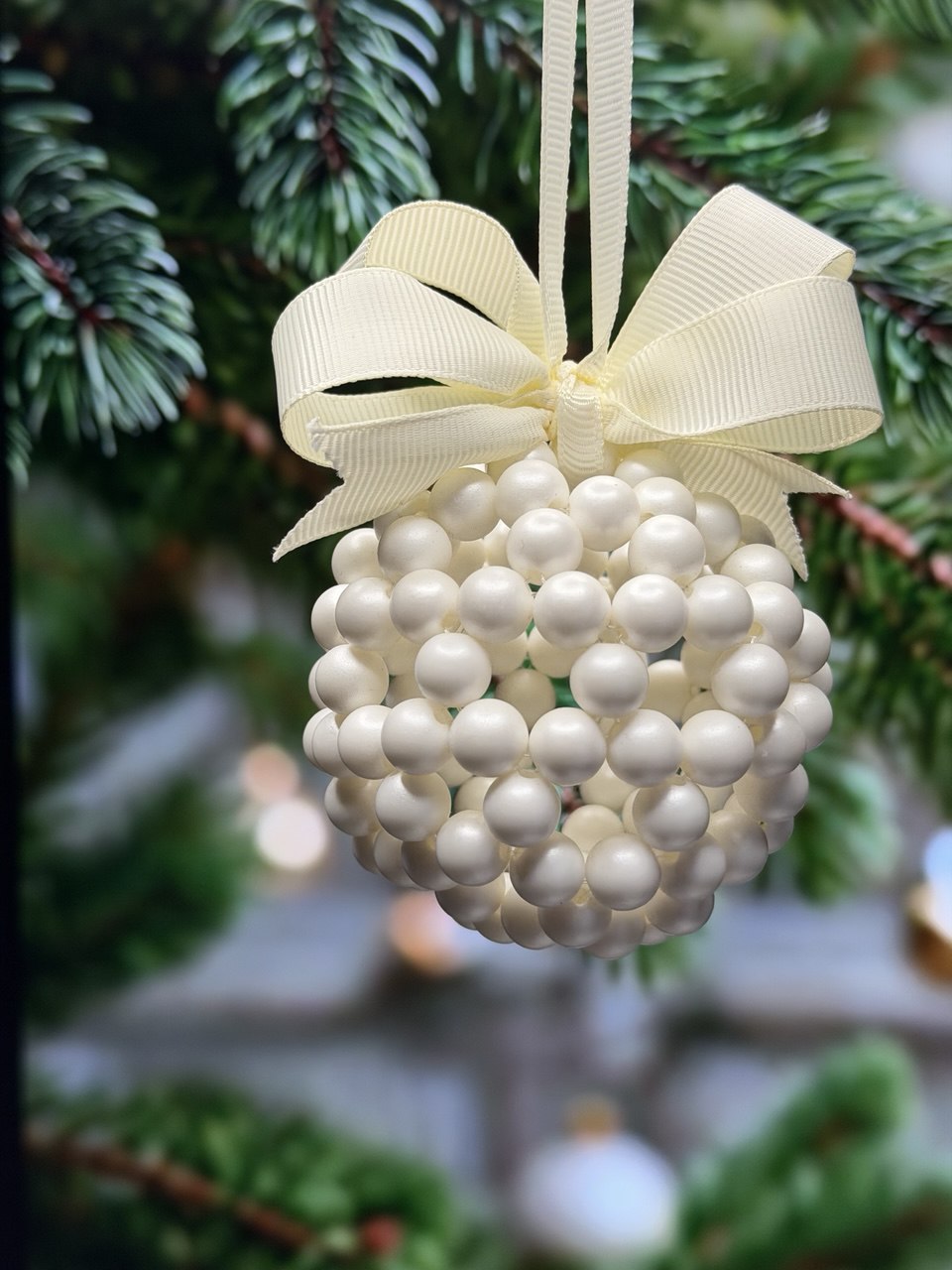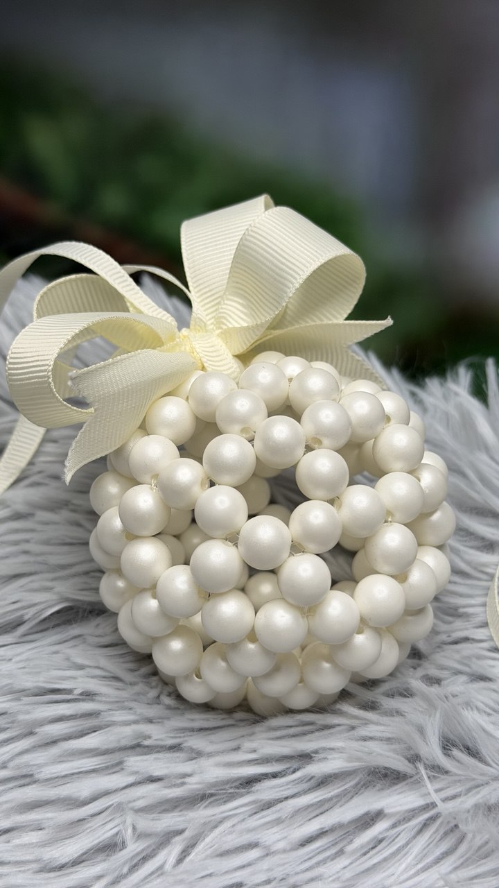 This exquisite handcrafted ornament features a charming acorn design adorned with lustrous cream-colored beads arranged in a clustered pattern. The ornament is topped with an elegant cream grosgrain ribbon bow, with matching ribbon for hanging. The delicate beading creates a sophisticated, vintage-inspired aesthetic that adds timeless elegance to any Christmas tree or holiday décor. Perfect for those who appreciate refined, classic ornament styles with a touch of handmade artistry.